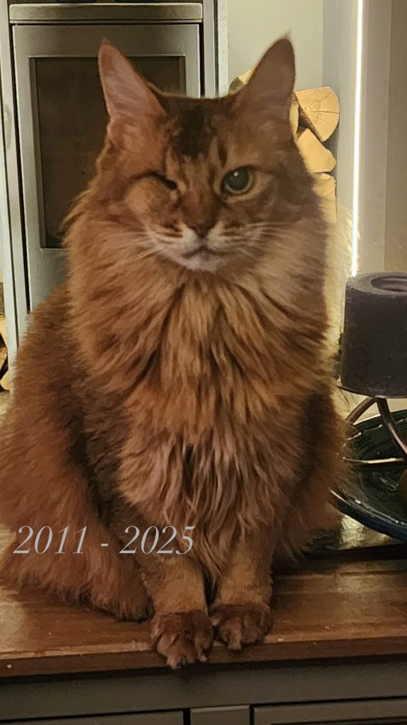 Sadly, we had to say goodbye to Mousse on the 22nd of December 2025. Her decline was sudden and rapid. Her kidneys did not share her zest for life and the cancer which she beat a few years ago saw its chance and returned. Mousse wanted to live, there was so much still to do; kittens to teach manners, girls to keep in line and, above all, look after Annelies! Her body could no longer keep up. Mousse successfully lived with asthma. She survived breast cancer. Although she lost her eye to a dreadful virus and most of her teeth, her love for me pulled her through. This time she lost her appetite (apart from Dreamies, naturally), was thirsty all the time, lost weight, looked less than her normal pristine self and, the last 2 days, was in pain. We spent the weekend and night keeping her as comfortable as we could and this morning we realised there was but one thing to do for her. She fought her sedation but immediately relaxed in my arms and, with a last Dreamie and lots of kisses and cuddles, left us behind peacefully.